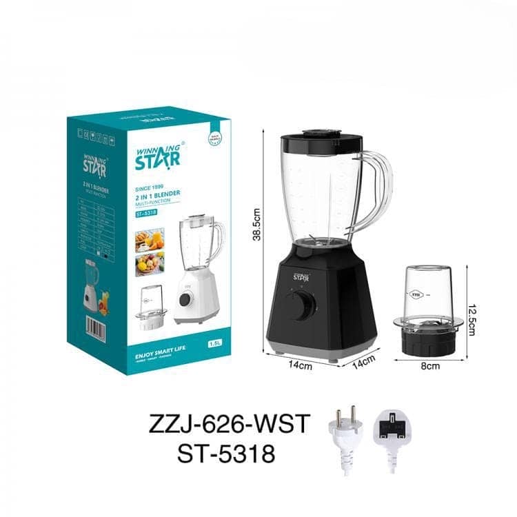 Juicer (2-in-1), ST-5318, electrician European plug, WinningStar brand, Capacity: 1.5L, Voltage: AC220V-240V, Frequency: 50/60Hz, Power: 350W, Material: 7025 pure copper motor (with temperature-controlled fan/over blocking test), 2*0.5 square national standard pure copper brand new PVC power cord exposed 95cm. PP body, PP cup cover, PC large cup + four pages of 201 stainless steel blade + full copper bearings, PC small cup + two pages of 201 stainless steel blade + copper and iron bearings, Function: mixing / grinding, Accessories: manual, warranty card, certificate of conformity, nameplate stickers, warning labels, product size: 385 * 140mm, color box size: 192 * 192 * 413mm, color: black gray / white grey Mixed (New) Order, a free sponge brush)