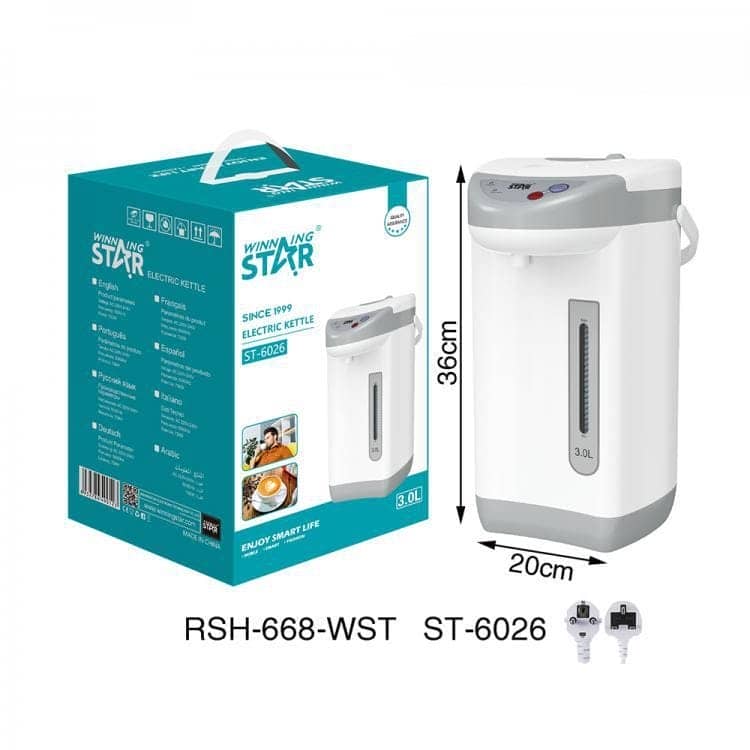 Electric Boiling Water Bottle, ST-6026, French Pipe Insert, Capacity: 3L, WinningStar brand, Voltage: AC220V-240V, Frequency: 50/60Hz, Power: 730W, Material: tinplate shell, PP plastic parts, 304 stainless steel inner liner, 3*0.75 square pure copper brand new PVC power cord total length of 1.2 meters, Function: removable Top cover (easy to clean), top cover with safety lock (manually closed to open), dry burning protection (no water automatically shut down), air pump / electric pump / touch the cup of 3 kinds of water options, automatic boiling (boiling constant temperature of about 70 degrees), accessories: manual, warranty card, certificate of conformity, nameplate stickers, product size: 360 * 270 * 200mm, color box size: 245 * 245 * 380mm, color Color: white + grey, Packing: 5 layers UV handle color box + 5 layers hardened outer box.