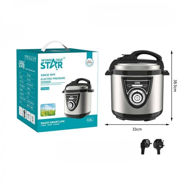Electric Pressure Cooker, ST-9315, Solid French Pipe Insert, Capacity: 6L, WinningStar brand, Voltage: AC220V-240V, Frequency: 50/60HZ, Power: 1000W, Material: 3*0.75 square national standard pure copper brand new PVC power cord total length 1.2 meters, 0.35mm thick 410 stainless steel shell, 435g heating plate ( Bare plate), 510g aluminum single spray liner, PP plastic measuring cup, rice spoon, PP black plastic shell, function: manual adjustment, product size: 330*385mm, color: stainless steel color + black plastic parts, (since January 1, 2022 onwards new orders, a free sponge brush). Package: (5 layers UV color box + 5 layers hardened outer box).