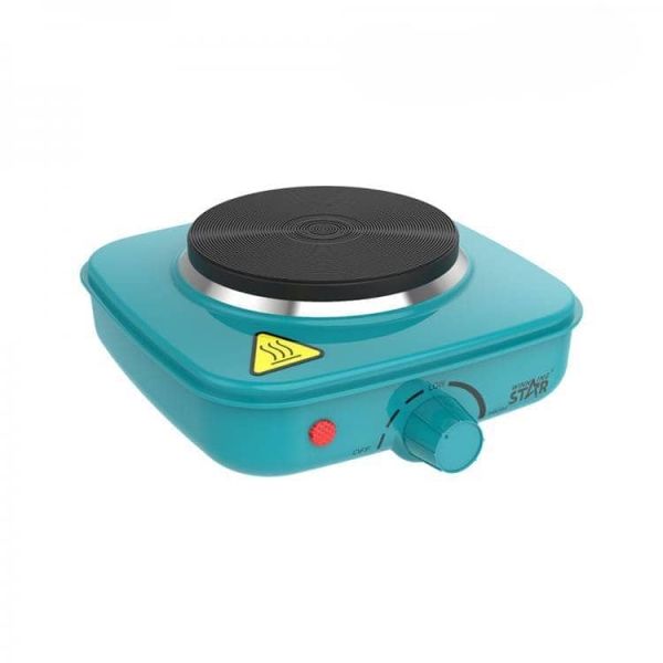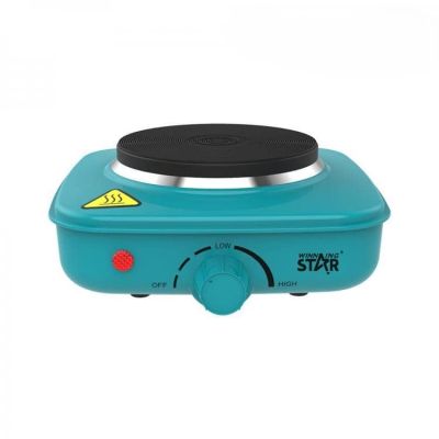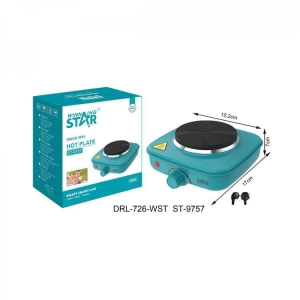 Electric stove, ST-9757, single die-casting disk, European plug, WinningStar brand, voltage: AC220-240V, 50/60Hz, power: 500W, 3 automatic bouncing thermostat, overheating protection, automatic thermostat, heating disk size: 106mm, heating disk material: die-casting disk + silicone coating process, shell material: cold tie plate spraying 0.5mm thickness The all-copper power cord 3*0.75mm*1M, exposed 0.9m, power indicator, accessories: manual, certificate of conformity, warranty card. Product size: 170 * 152 * 70mm, product color: blue. 3 layers of corrugated color box foam packaging