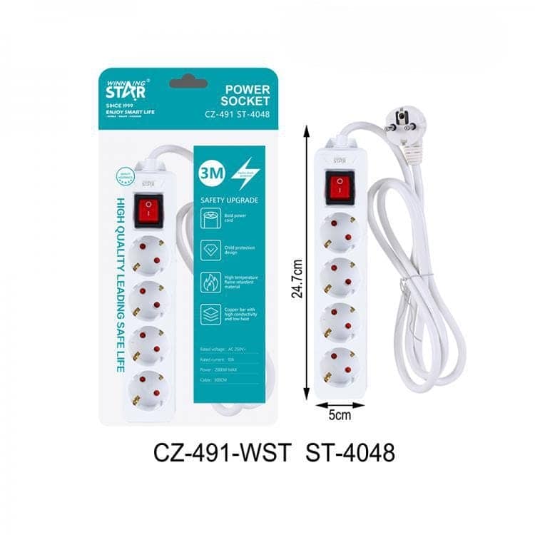 Socket, ST-4048(DES-114), Solid French Pipe Plug, 4 Position Euro Jack, WinningStar Brand, Packing: PVC bag. Voltage: AC220V-250V, Frequency: 50/60Hz, Power: 10A/2000W, Material: PP flame-retardant fireproof shell (flame-retardant temperature of 750 degrees), one piece of all-connected copper (fire wire zero line 0.5 thick, ground line 0.6 thick), 3 * 0.75 square brand new PVC power cord total length of 3 meters (fire wire zero line of pure copper (0.2 silk * 24 roots) + ground line copper-clad aluminum ( 0.195 silk * 24) power cord wire diameter tolerance in ± 0.002 or so), function: 1 switch to control 4 sockets, jacks with safety doors, product size: 247 * 50 * 40mm, color: white