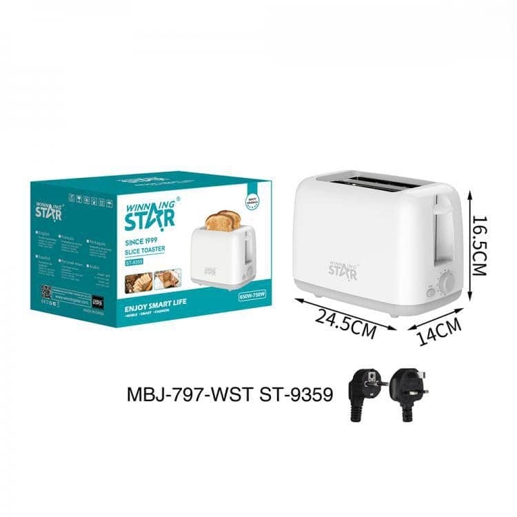 Toaster Oven, ST-9359, solid European plug, WinningStar brand, 3 layers corrugated color box, 2 slices toaster. Voltage: 220-240V, 50/60Hz, actual power: 650-750W. galvanized material metal inner side plate, bread automatically ejected, switch automatically off, 6-speed circuit board control (1-speed 60 seconds, 6-speed 180 seconds), 2 slots; control mode: mechanical control, heating mode: double-sided toasting, pure copper power cord: 3 * 0.75mm square, wire length 0.9m exposed 0.75m, material PP shell + top stainless steel 430, galvanized sheet slag tray, product size: 245*140*165mm, color: white + grey base.